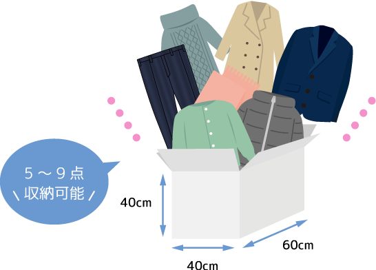 ダンボールに入る衣類の目安は、コートなどの厚めのお洋服で3枚~5枚程度、ニット・ジャケットなどで10枚~15枚程度、シャツ・パンツ類などは、それ以上になります。